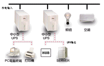 由上表可以證明UPS的長(zhǎng)期成本是最低的,所有電腦系統(tǒng)均非為短時(shí)間考慮的,即是為長(zhǎng)期的工作與目的,相信明智的選擇是“裝設(shè)不間斷電源”,電腦安心,您也安心。 UPS的使用? 1.UPS的供電方式 UPS的供電方式可分為集中供電方式和分散供電方式兩種。集中供電方式是指由一臺(tái)UPS向整個(gè)線路中各個(gè)負(fù)載裝置集中供電。 ![]() 分散供電方式是指多臺(tái)UPS電源對(duì)多路負(fù)載裝置分散供電。 ![]() 這兩種供電方式都有各自的優(yōu)缺點(diǎn)具體如下: