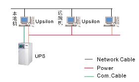 3、多計算機(jī)監(jiān)控管理 網(wǎng)絡(luò)中指定的某一臺服務(wù)器或工作站(稱本地機(jī))通過RS-232串口線與UPS通訊,網(wǎng)絡(luò)上其它服務(wù)器或工作站(遠(yuǎn)端機(jī))與本地機(jī)通訊,本地機(jī)與遠(yuǎn)端機(jī)都運行UPS的電源管理軟件,由本地機(jī)控制管理一臺或多臺遠(yuǎn)端機(jī)的報警關(guān)機(jī)等功能。 |