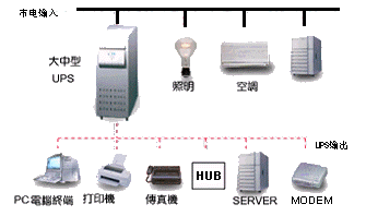 由上表可以證明UPS的長(zhǎng)期成本是最低的,所有電腦系統(tǒng)均非為短時(shí)間考慮的,即是為長(zhǎng)期的工作與目的,相信明智的選擇是“裝設(shè)不間斷電源”,電腦安心,您也安心。 UPS的使用? 1.UPS的供電方式 UPS的供電方式可分為集中供電方式和分散供電方式兩種。集中供電方式是指由一臺(tái)UPS向整個(gè)線路中各個(gè)負(fù)載裝置集中供電。 ![]() 分散供電方式是指多臺(tái)UPS電源對(duì)多路負(fù)載裝置分散供電。 ![]() 這兩種供電方式都有各自的優(yōu)缺點(diǎn)具體如下: